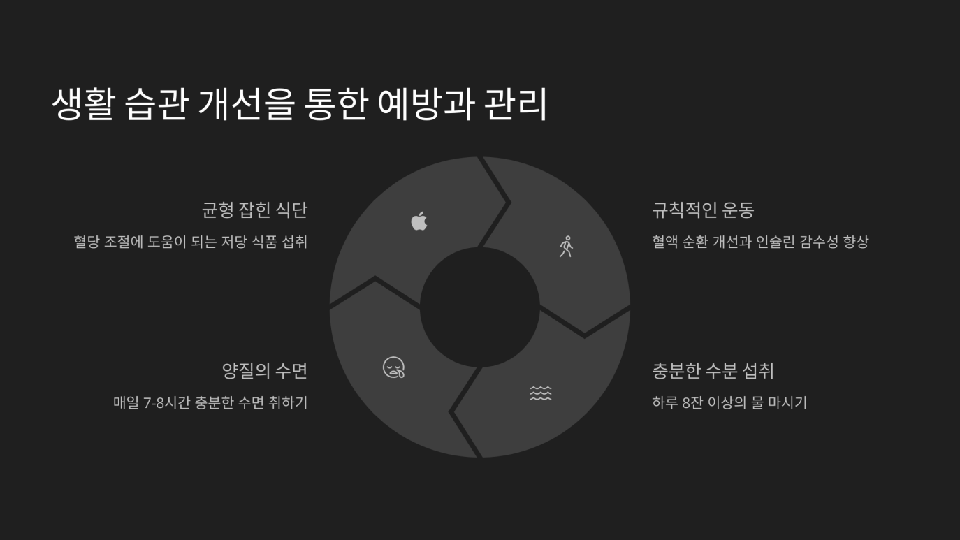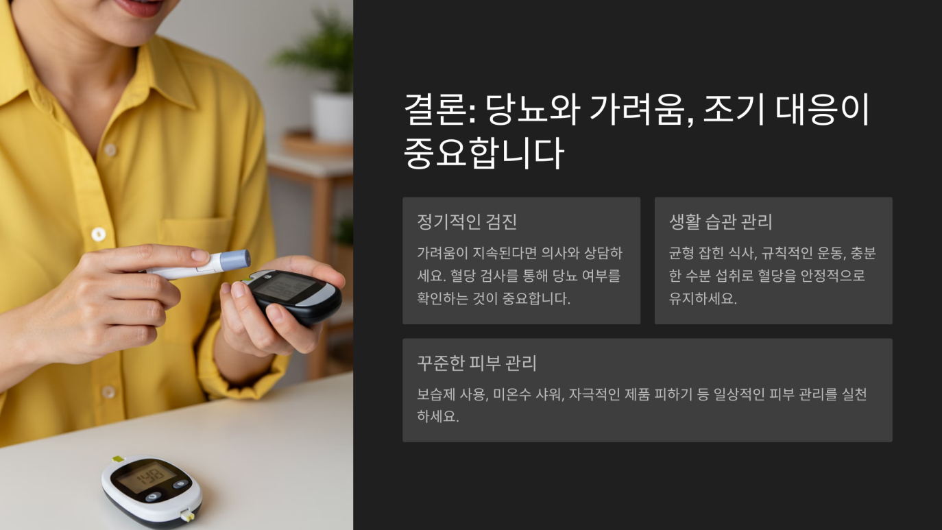 가려움증은 단순한 증상으로 끝나지 않습니다. 오히려 생활 습관 개선의 필요성을 알리는 '경고등' 역할을 합니다. 지속적인 고혈당 상태를 개선하기 위해서는 식단 조절과 규칙적인 운동, 적절한 약물 치료 등이 필수적입니다.