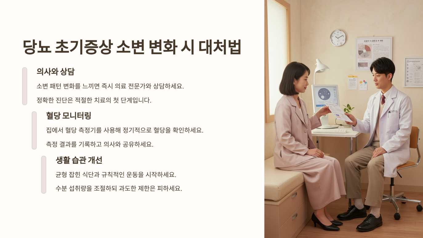 A. 소변 빈도 증가가 반드시 당뇨를 의미하지는 않습니다. 신장이나 방광질환, 혹은 수분 섭취 과다로도 빈뇨가 발생할 수 있습니다. 그러나 “당뇨 초기증상 소변” 변화를 포함해 극심한 갈증, 피로감, 시야 흐림 같은 다른 증상이 동반된다면 혈당 검사를 받아보는 것이 좋습니다. 너무 오래 방치하다가 뒤늦게 발견하면 합병증 위험이 높아질 수 있으니 주의가 필요합니다.