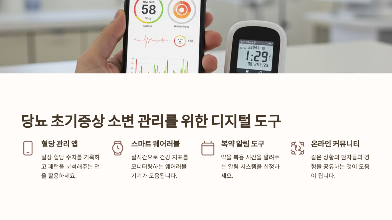 2025년 기준, 한국의 의료 기술은 더욱 발전하여 모바일 앱이나 스마트워치 등 웨어러블 기기로 혈당 및 소변 상태를 간편하게 측정하고 추적할 수 있는 솔루션이 증가하고 있습니다. 예를 들어, 소변 검사지에 스마트폰 카메라를 비추면 자동으로 데이터를 분석해주는 서비스도 등장하고 있습니다. 이런 기술들을 적극 활용하면 당뇨 초기증상을 조기에 파악하고, “당뇨 초기증상 소변” 변화를 쉽게 모니터링하며 생활 습관을 개선하는 데 큰 도움을 받을 수 있습니다.