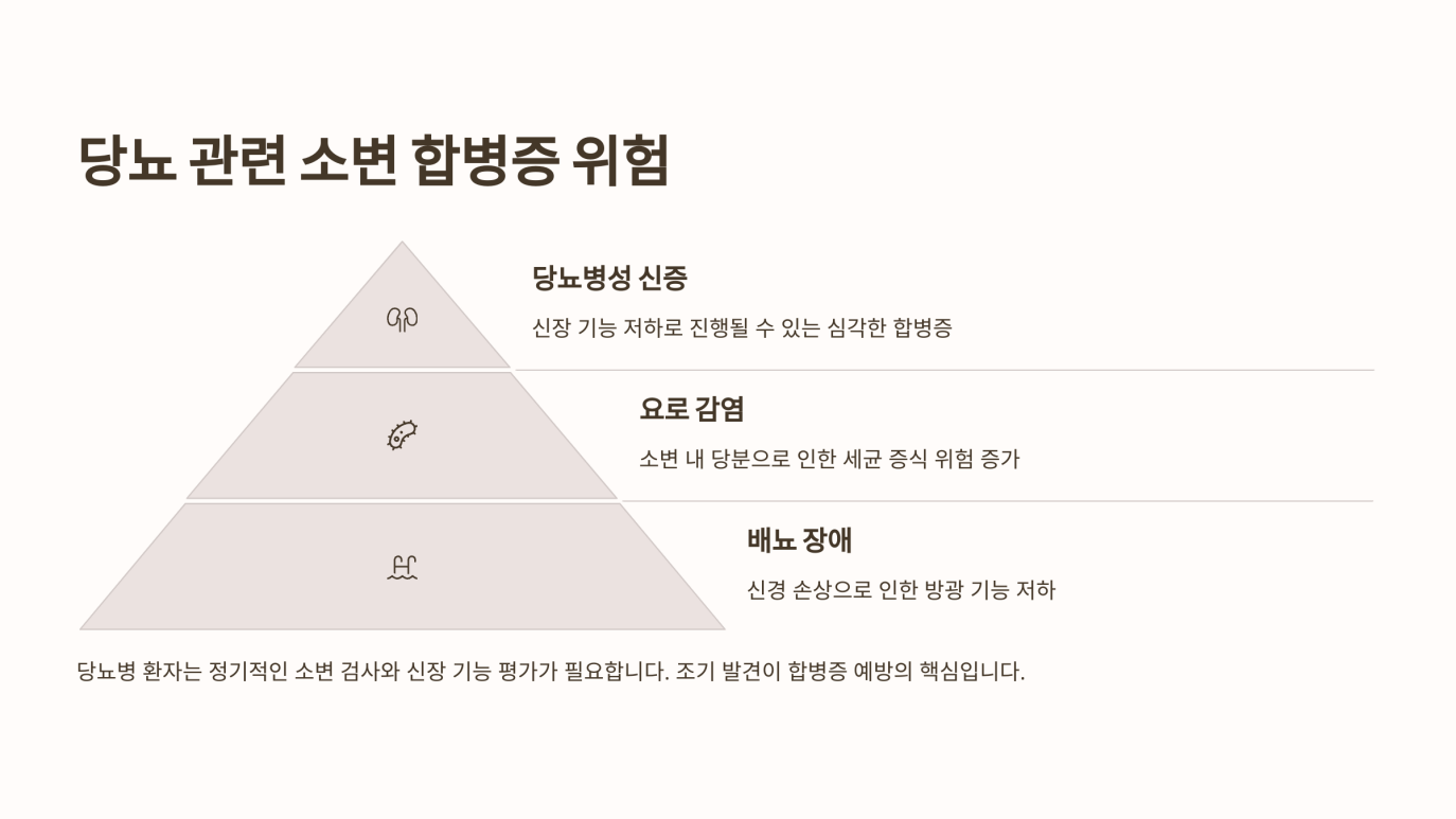 당뇨 초기증상으로 빈뇨가 생기고, 소변 중 당 농도가 올라가면 세균이 번식하기 좋은 환경이 조성됩니다. 결과적으로 방광염이나 신우신염 등 요로감염이 발생하기 쉬워집니다. 잦은 소변, 잔뇨감, 소변 시 통증 등 증상이 심해진다면 즉시 병원 검진을 받아야 합니다.