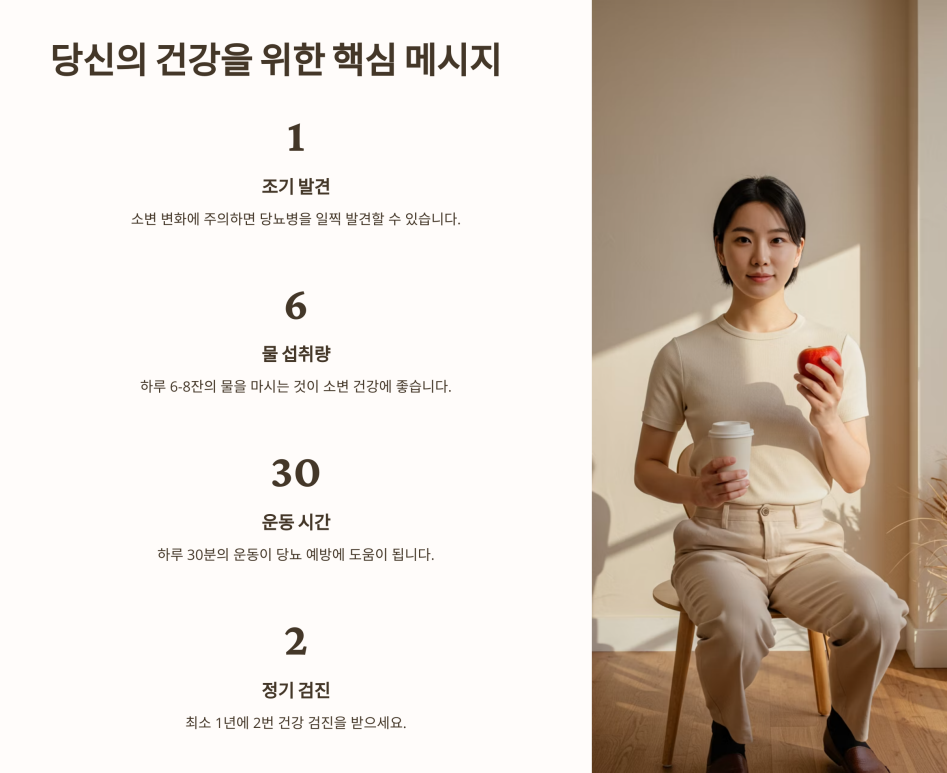 - 정기 검사 습관화: 연 1회 이상의 건강검진을 통해 혈당과 소변 상태를 체크하세요.
