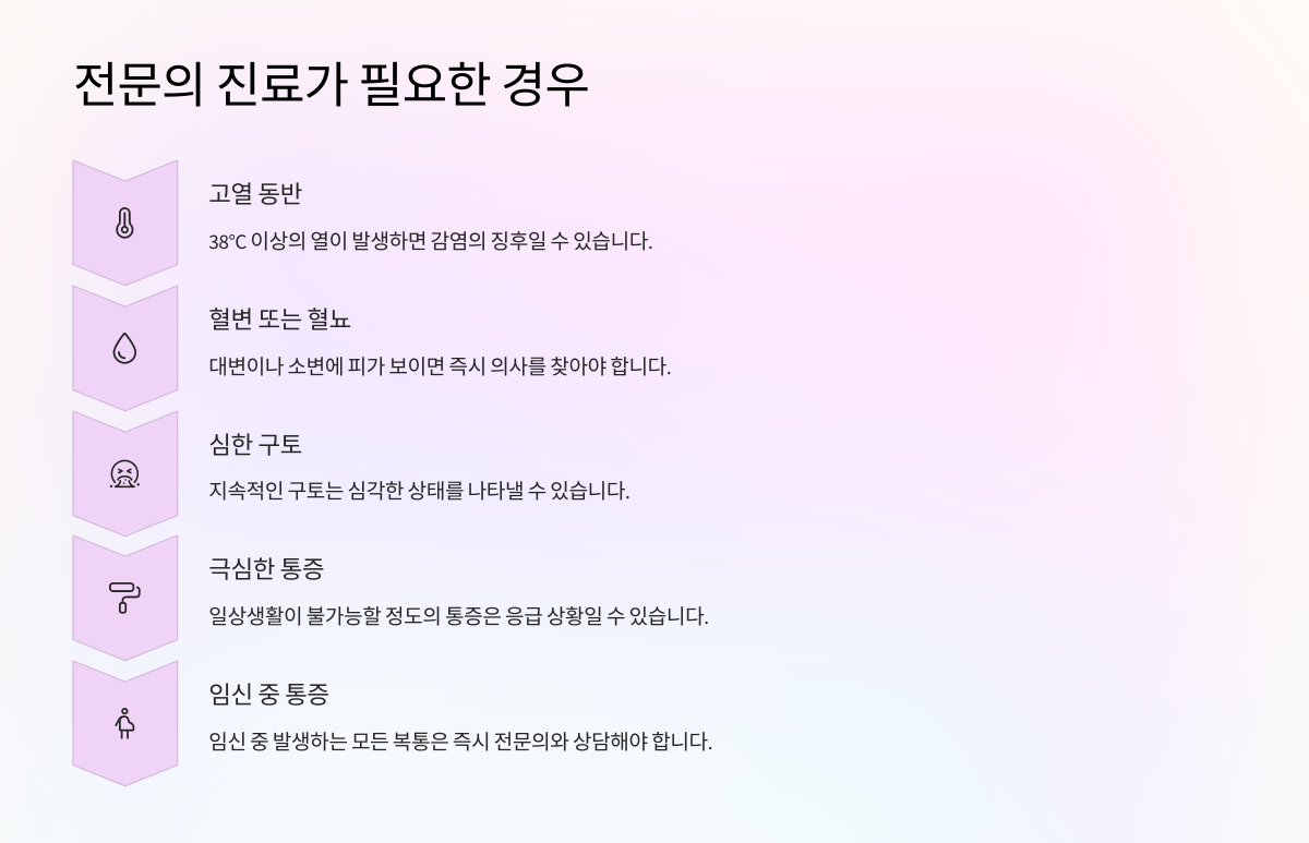 통증이 수시간 이상 지속되고, 다른 소화기 증상(설사, 변비)이나 발열 등이 동반된다면 대장 질환이나 염증성 질환 가능성이 큽니다.