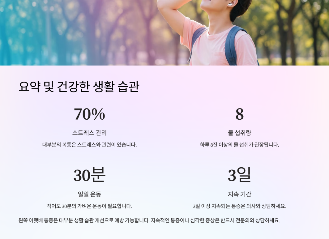 왼쪽 아랫배 누르면 통증이 생기는 원인은 대장 질환(게실염, 과민성 대장 증후군), 비뇨기계 질환(요로결석), 여성 생식기 질환(난소낭종, 자궁근종), 골반 내 염증성 질환, 근골격계 문제 등 다양합니다. 통증 양상과 동반 증상을 꼼꼼히 살펴보고, 생활습관을 점검해보는 것이 첫 단계입니다. 증상이 일시적이고 경미하다면 식이요법과 휴식, 스트레스 관리를 통해 호전을 기대할 수 있지만, 통증이 심하거나 오래 지속된다면 전문의 상담을 받아 정확한 진단과 치료가 필수적입니다. 또한, 건강검진을 통해 대장, 비뇨기, 여성 생식기 건강을 정기적으로 체크하는 습관을 길러야 재발을 예방할 수 있습니다.