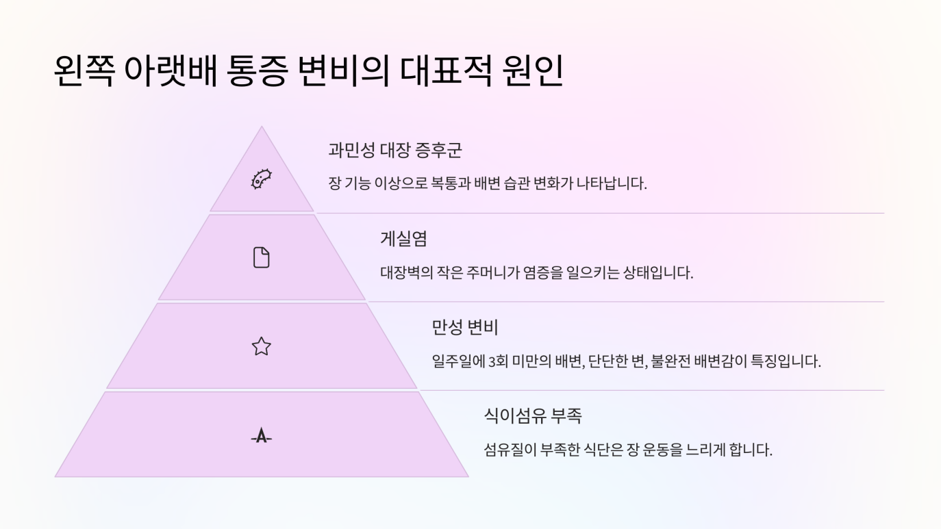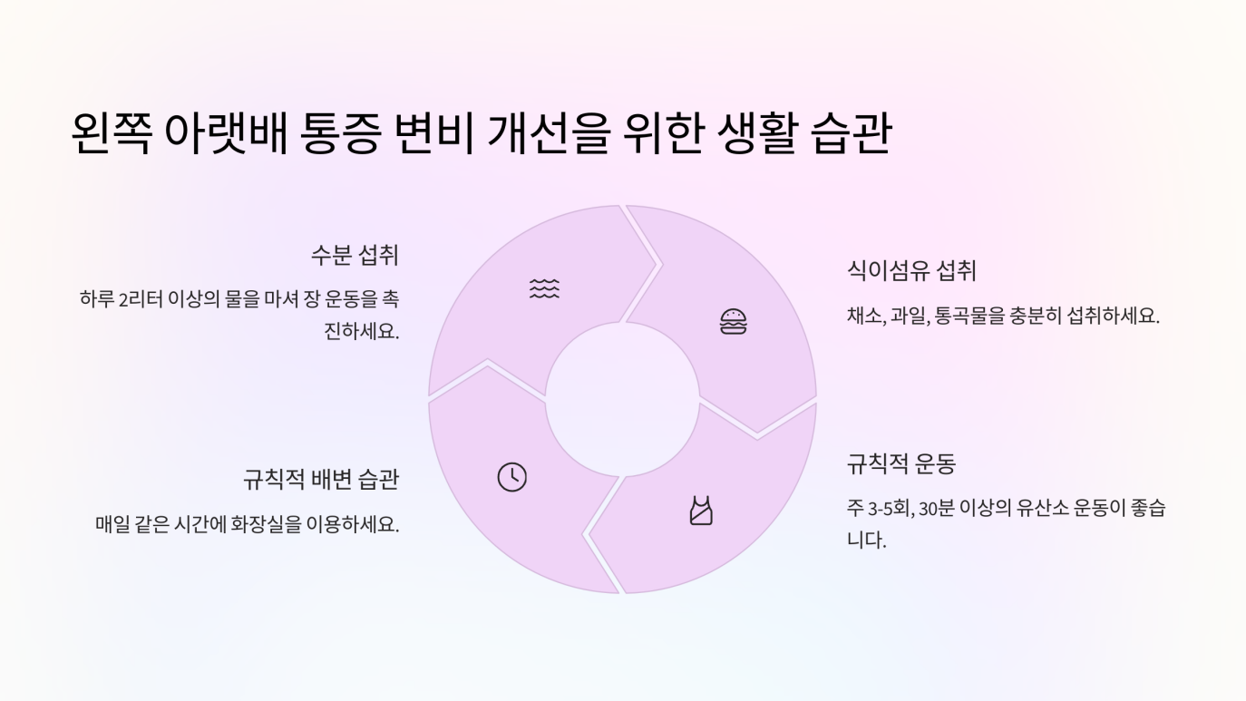 왼쪽 아랫배 통증 변비는 단순히 변비만의 문제가 아니라, 장내 염증이나 게실염, 과민성 대장증후군, 장유착 등 다양한 질환이 숨겨져 있을 수 있다는 점에서 주의 깊게 살펴봐야 합니다. 통증이 지속적이거나 다른 증상(혈변, 발열, 구토 등)이 동반된다면, 정확한 검진을 통해 기저 질환이 있는지 확인해야 합니다.