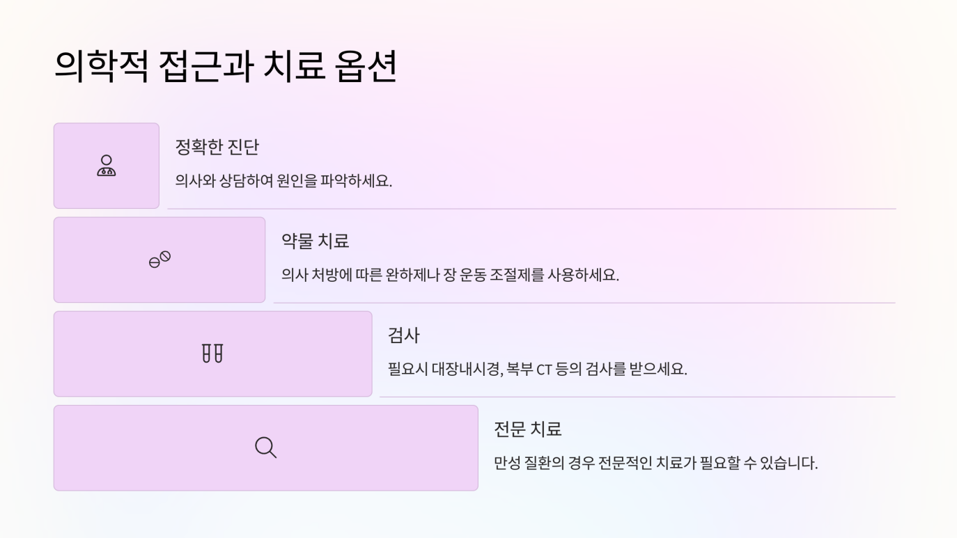 가벼운 통증이지만 수주 이상 지속된다면, 만성 변비나 과민성 대장증후군과 같은 기능성 장질환을 의심할 수 있습니다. 또한 잦은 복부팽만, 가스, 더부룩함 등이 동반되면 생활의 질이 크게 떨어질 수 있습니다. 이럴 경우 생활 습관 개선뿐만 아니라 전문가의 진료 및 약물 치료도 고려해야 합니다.