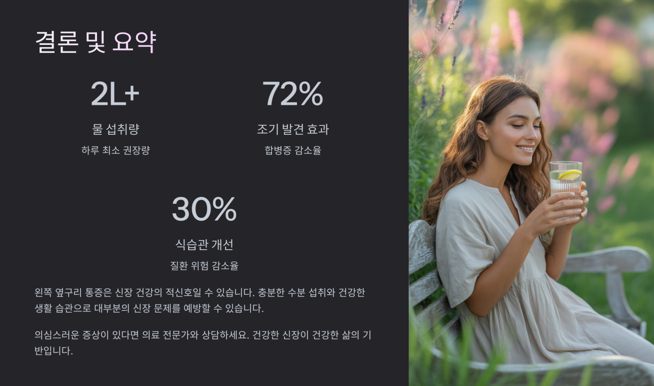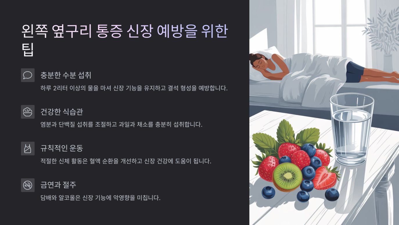 결국 왼쪽 옆구리 통증 신장 문제를 예방하려면 건강한 생활 습관이 기본이라는 점을 잊지 마세요.